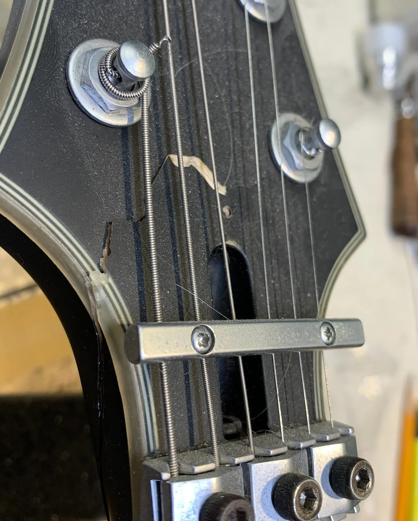 View fullsize Headstock break on this Schecter. The string locks are still holding it in tune so I spent some time this afternoon playing for a while πŸ˜‚ it’s plays great! I was told it broke a year ago. I love when out the norm stuff happens in the shop. I&r