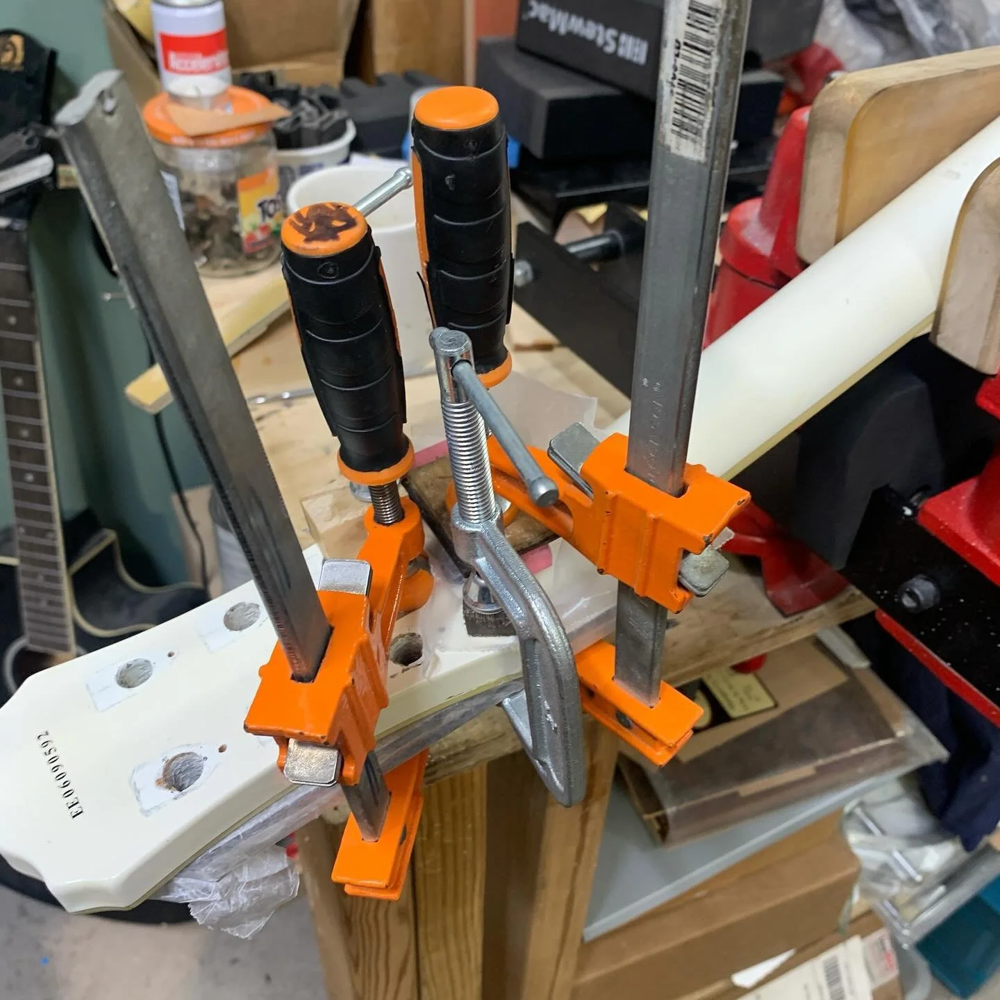 View fullsize Epi custom headstock repair. Clamped up w/ west system gflex epoxy. Strong stuff. It will hold 10’s no problem. I sanded n blended the black I sprayed and w/ clear coat will absolutely look good. I’ll post follow up pics. Next is sand the