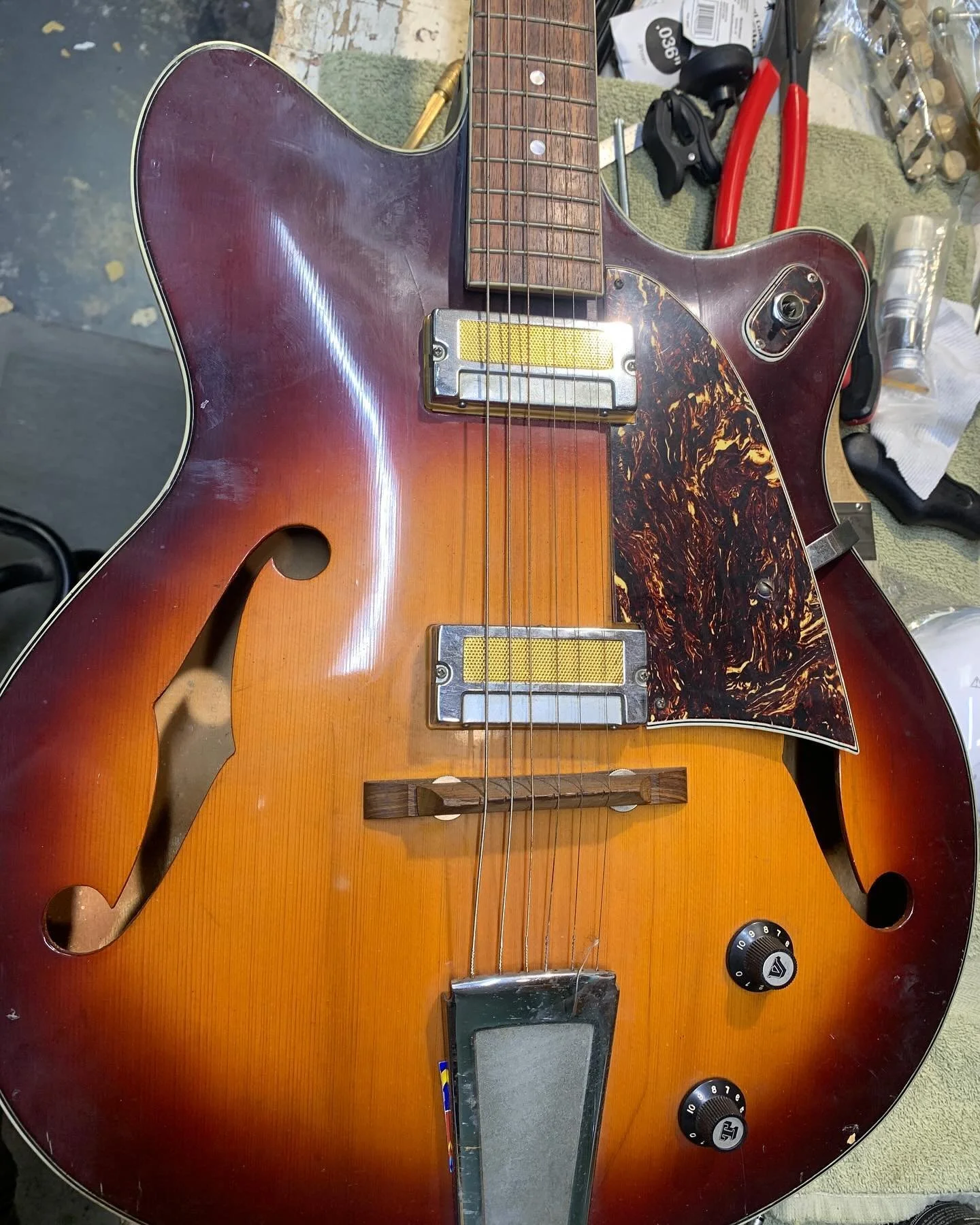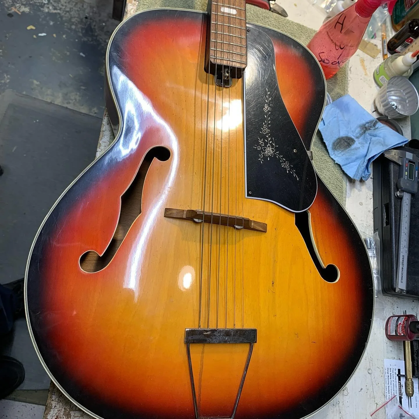 View fullsize This old Goyatone 12er came outta the fire with a story to tell! It took some work cleaning it up and getting the tuners working but it was worth it! Someone along the way made the neck joint permanent but it’s still fun to play! That bridge pi