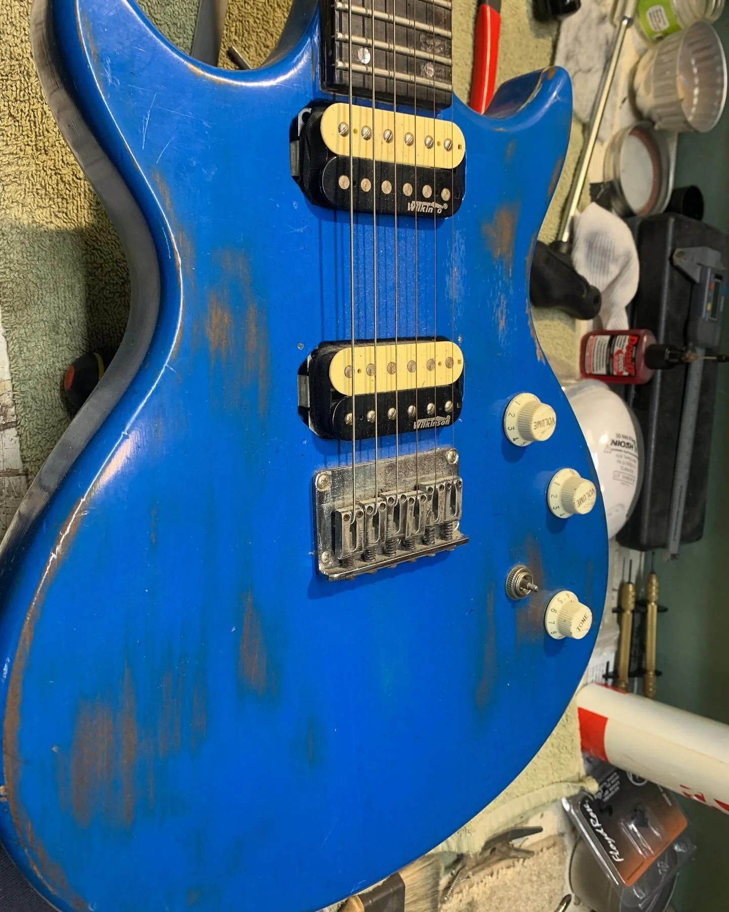 View fullsize This one’s going down as the most punk rock stick of all time to hit the bench! This Carvin is still very fun to play after cleaning up the guitar and straightening the neck out. Strap button is in a strange place but hey it’s not mine so